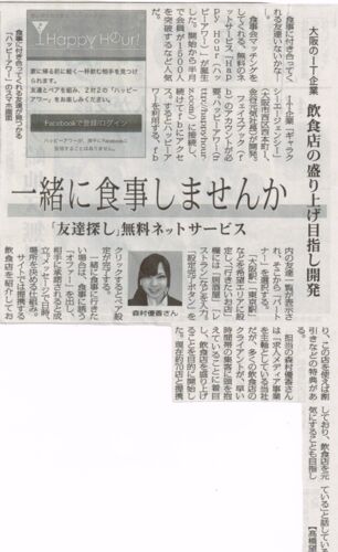 こんにちは。広報の森村です。 9月10日(火)、朝刊大阪版の毎日新聞にて、当社の新サービス『Happy Hour』が紹介されました。 毎日新聞様ありがとうございます。 気軽に集まり、お得に飲んで楽しむ飲み会マッチングサイト『Happy Hour』を これからも宜しくお…